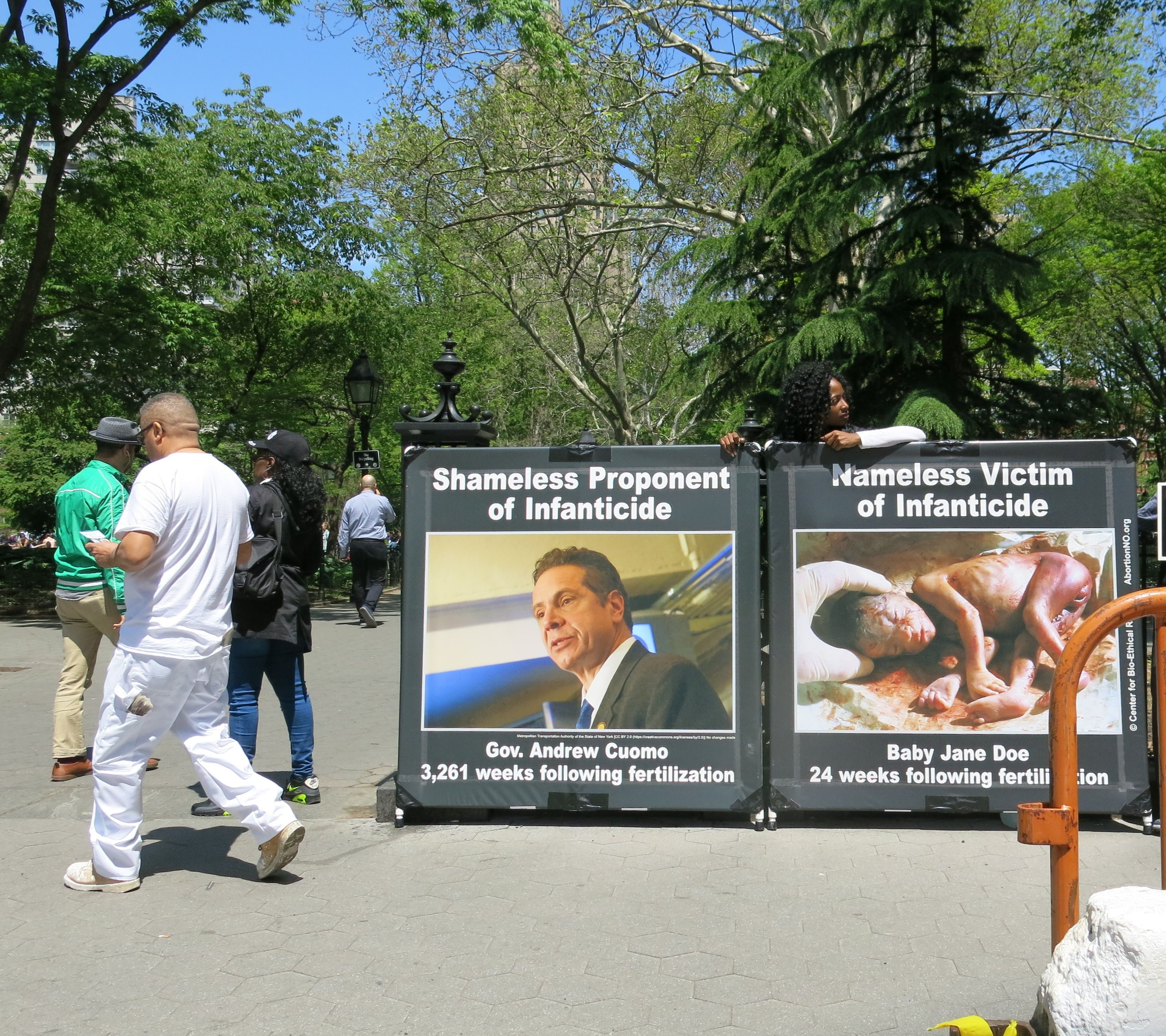 New York legislators passed a diabolical law legalizing abortion through birth, and it was signed by Governor Cuomo on January 22, 2019. Consequently, we traveled to New York City in May to show the public exactly what their government had approved. One of our signs showed Gov. Cuomo’s photo next to that of an aborted baby with the caption “Gov. Andrew Cuomo 3261 weeks following fertilization. Baby Jane Doe 24 weeks following fertilization.” We hoped that by exposing the insanity of aborting a viable, third trimester baby (something most people already agree is wrong), we could make people consider the possibility that aborting younger babies is just as wrong.