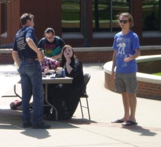 Challenging students and passersby alike in front of Catholic University of America.