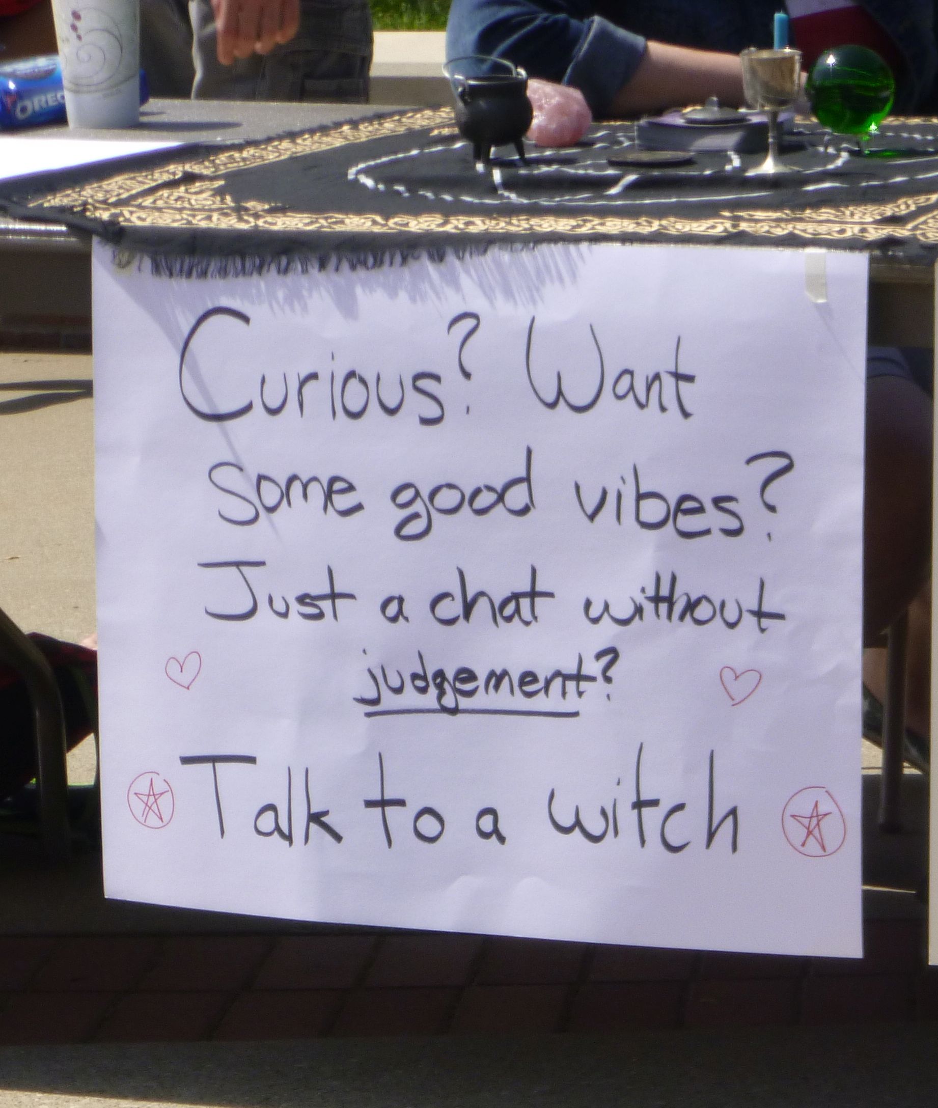Amazingly, this lengthy conversation about salvation with a witch and two atheists was one of the most peaceful I have ever had! I had expected great trouble, but instead experienced engagement at such a deep, meaningful level, with no interruptions. Their hearts were so open to listen! I knew that God was doing a great work, and that team members were praying for us. I urged the students to respond to God, made myself available to talk again anytime that afternoon, and hugged them all before leaving their table.