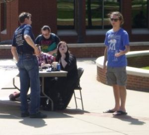 Signs visible to pedestrians and vehicular traffic alike at Liberty University. By standing on a busy sidewalk, we reached many thousand students.